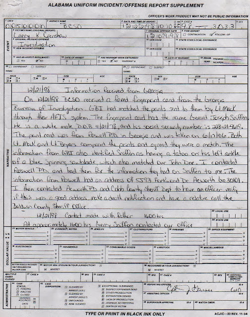 Since my son had a prior 1996 arrest in Roswell, Georgia, his prints should have been in the system and a positive identification should have been made within minutes of the 12/10/98 Alabama "John Doe" entry into the database.